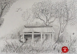 I was terrified when I was starring for few minutes at an empty paper with few lines not knowing where to start than I made a big decision and went for something easy like big black spot inside of the shed. Then I spread cross roof, wood, background, trees and so on. When I finished with all "required parts" I added my own such as additional tree branch on the left, bees, birds and butterfly.